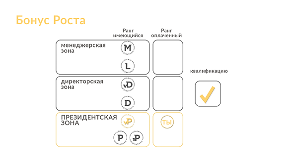 Мы вводим разделение на 3 зоны: менеджерскую, директорскую и президентскую. Если когда-либо в истории своего сотрудничества с Colway International Партнер имел звание, например, В-П, то чтобы получить квалификацию на Бонус Роста, он должен находиться в президентской зоне. Снижение до директорской зоны, например, до ранга Директора, означает, что Партнер не получит квалификации. После возвращения в президентскую зону, Вы получите квалификацию. Аналогично и для других групп.