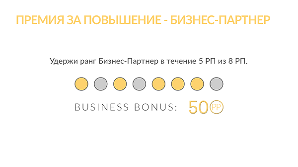 подняться на ранг Бизнес-Партнер и поддерживать его в течение 5 из 8 следующих